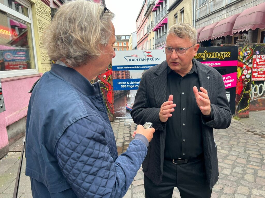 Sieghard Wilm, Pastor der St. Pauli-Kirche und Projekt-Initiator, zeigt auf, warum an genau diesem Ort der menschenverachtende Umgang der Nationalsozialisten mit dem Thema Prostitution sichtbar wird.